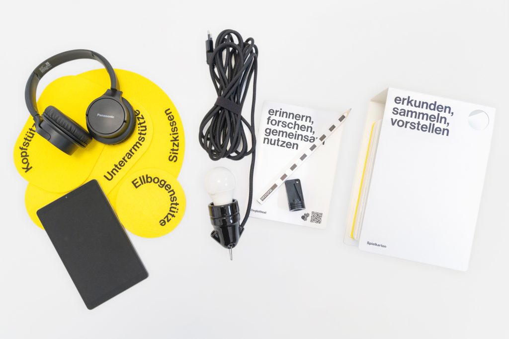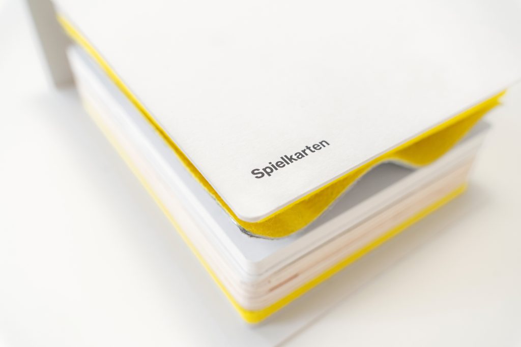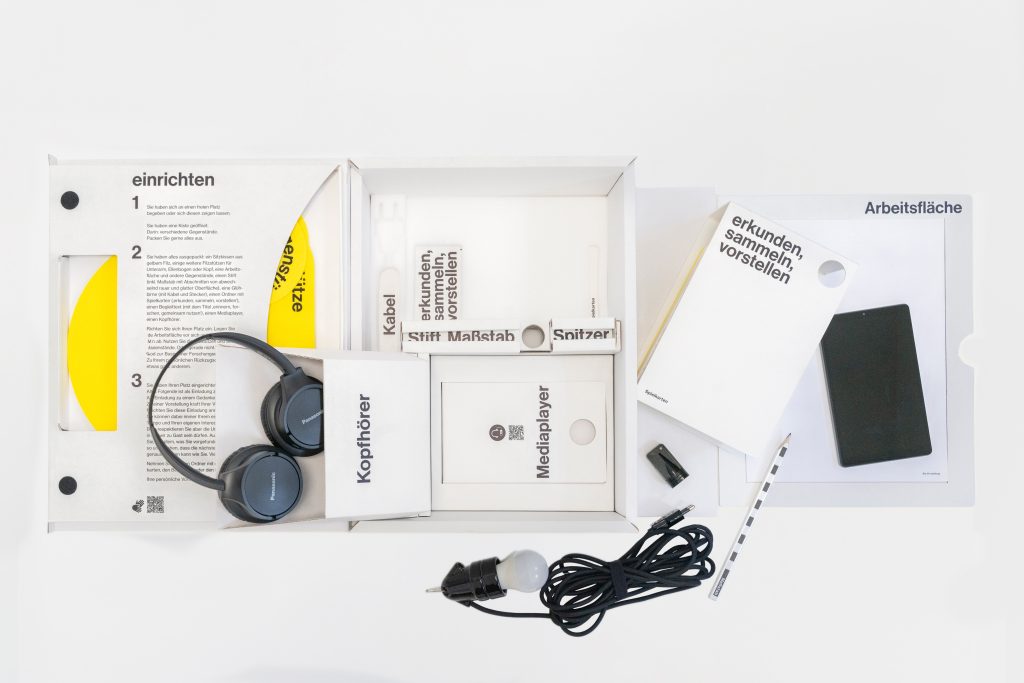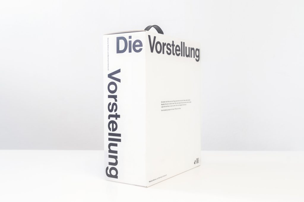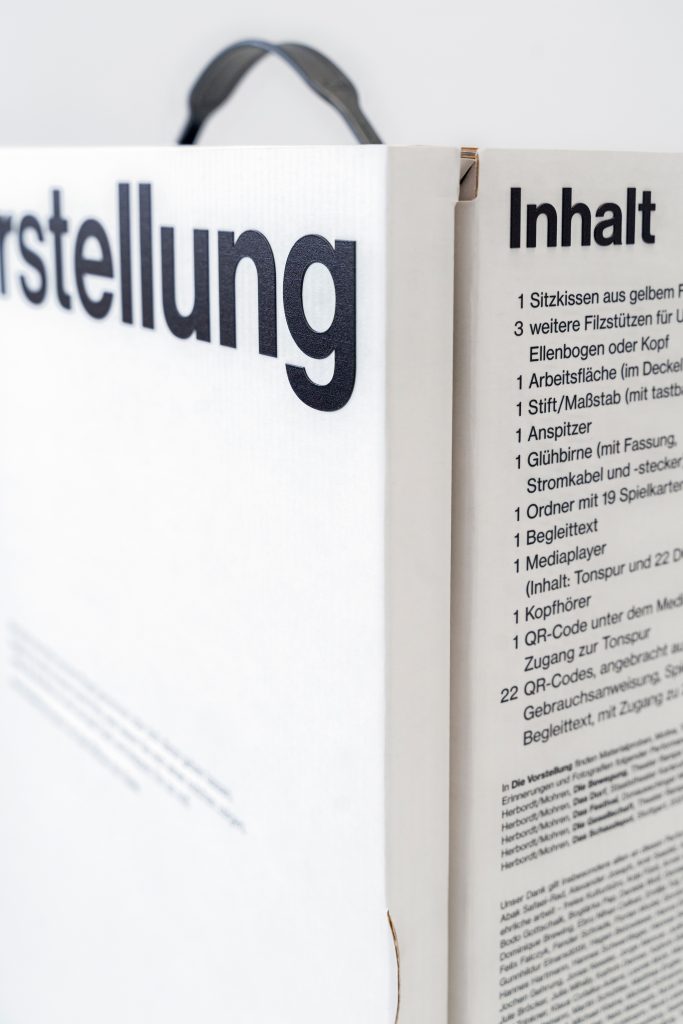,Die Vorstellung‘ ist eine Performance für eine Zuschauer*in. Alles was für die Performance benötigt wird, lagert frei zugänglich im Regal einer Bücherei, im Leseraum eins Archivs oder – wie hier – im Schaudepot. Wie ein Buch. Wird das Buch aufgeklappt, finden sich darin: Spielkarten, ein Medienplayer, ein Begleittext, mehrere Filzstützen und andere Gebrauchsgegenstände. Mit dem Öffnen beginnt eine Erkundungstour durch die umgebende Institution. Mit all ihren Zugängen und Ausschlüssen. In Schrift-, Laut- und Deutscher Gebärdensprache, mit integrierter Audiodeskription. Zuschauer*innen bestimmen die Dauer ihrer Vorstellung selbst. Sie können die Reihenfolge einzelner Bestandteile für sich festlegen und neue hinzufügen. Oder es sich vorstellen. Zum Beispiel: