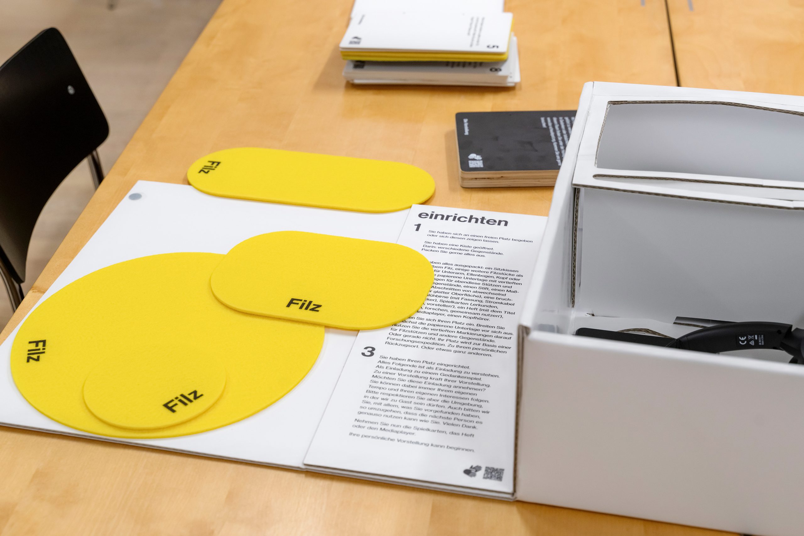 ,Die Vorstellung‘ ist eine Performance für eine Zuschauer*in. Alles was für die Performance benötigt wird, lagert frei zugänglich im Regal einer Bücherei, im Leseraum eins Archivs oder – wie hier – im Schaudepot. Wie ein Buch. Wird das Buch aufgeklappt, finden sich darin: Spielkarten, ein Medienplayer, ein Begleittext, mehrere Filzstützen und andere Gebrauchsgegenstände. Mit dem Öffnen beginnt eine Erkundungstour durch die umgebende Institution. Mit all ihren Zugängen und Ausschlüssen. In Schrift-, Laut- und Deutscher Gebärdensprache, mit integrierter Audiodeskription. Zuschauer*innen bestimmen die Dauer ihrer Vorstellung selbst. Sie können die Reihenfolge einzelner Bestandteile für sich festlegen und neue hinzufügen. Oder es sich vorstellen. Zum Beispiel: