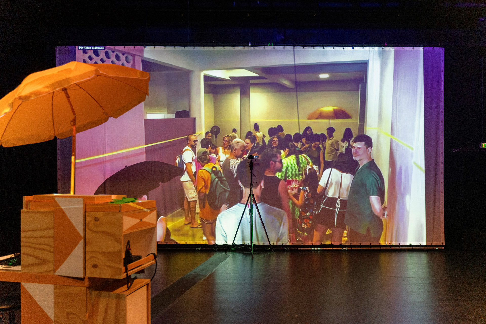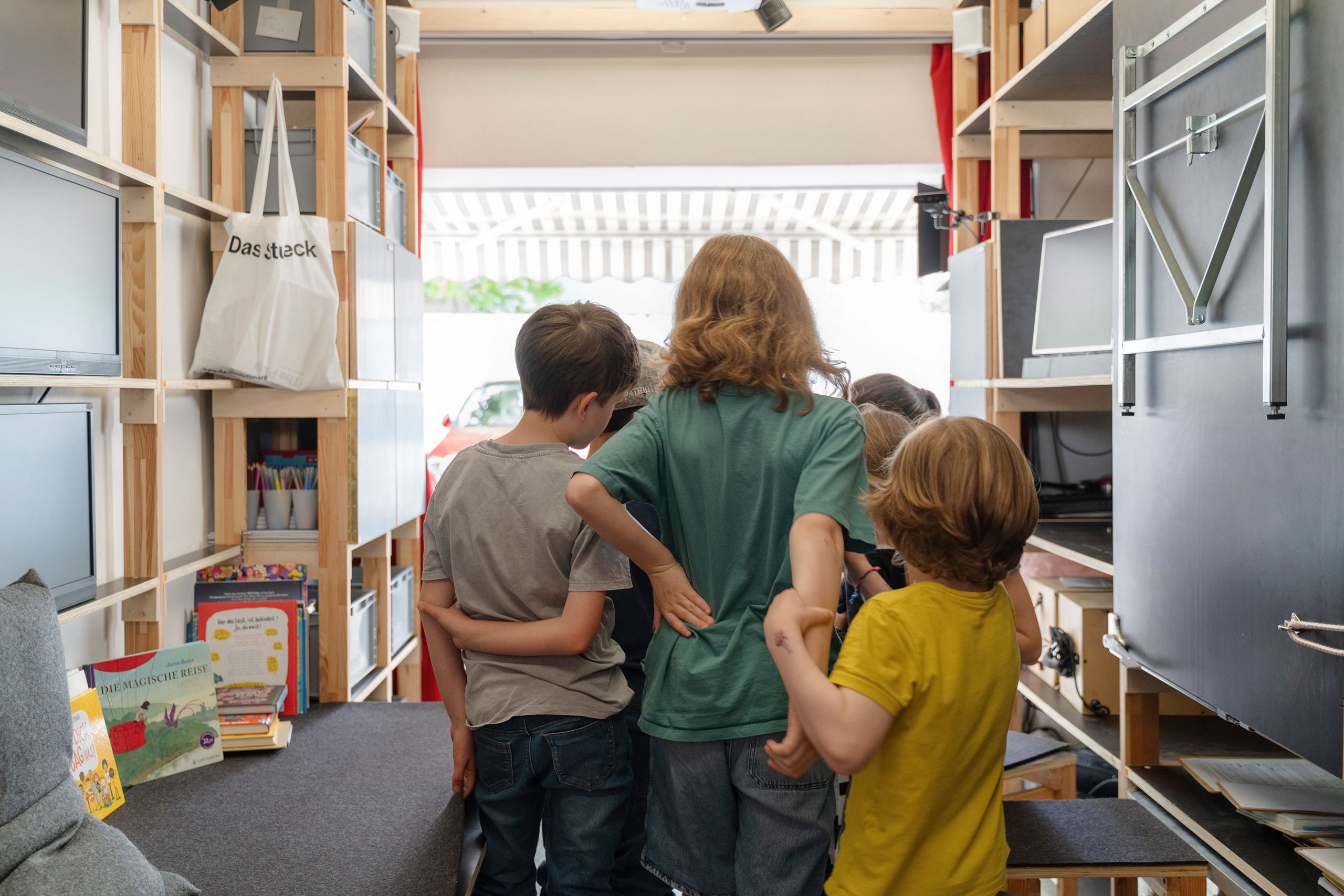 ,Die Kinderbibliothek‘ ist eine begehbare Performance-Installation. An zwei Orten gleichzeitig. Dazwischen: der Atlantik. Die Verbindung wird über digitale Konferenztechnik und Performer:innen an beiden Orten aufrechterhalten. In Salvador/Bahia und Stuttgart. Von Kindern und Erwachsenen gleichermaßen.