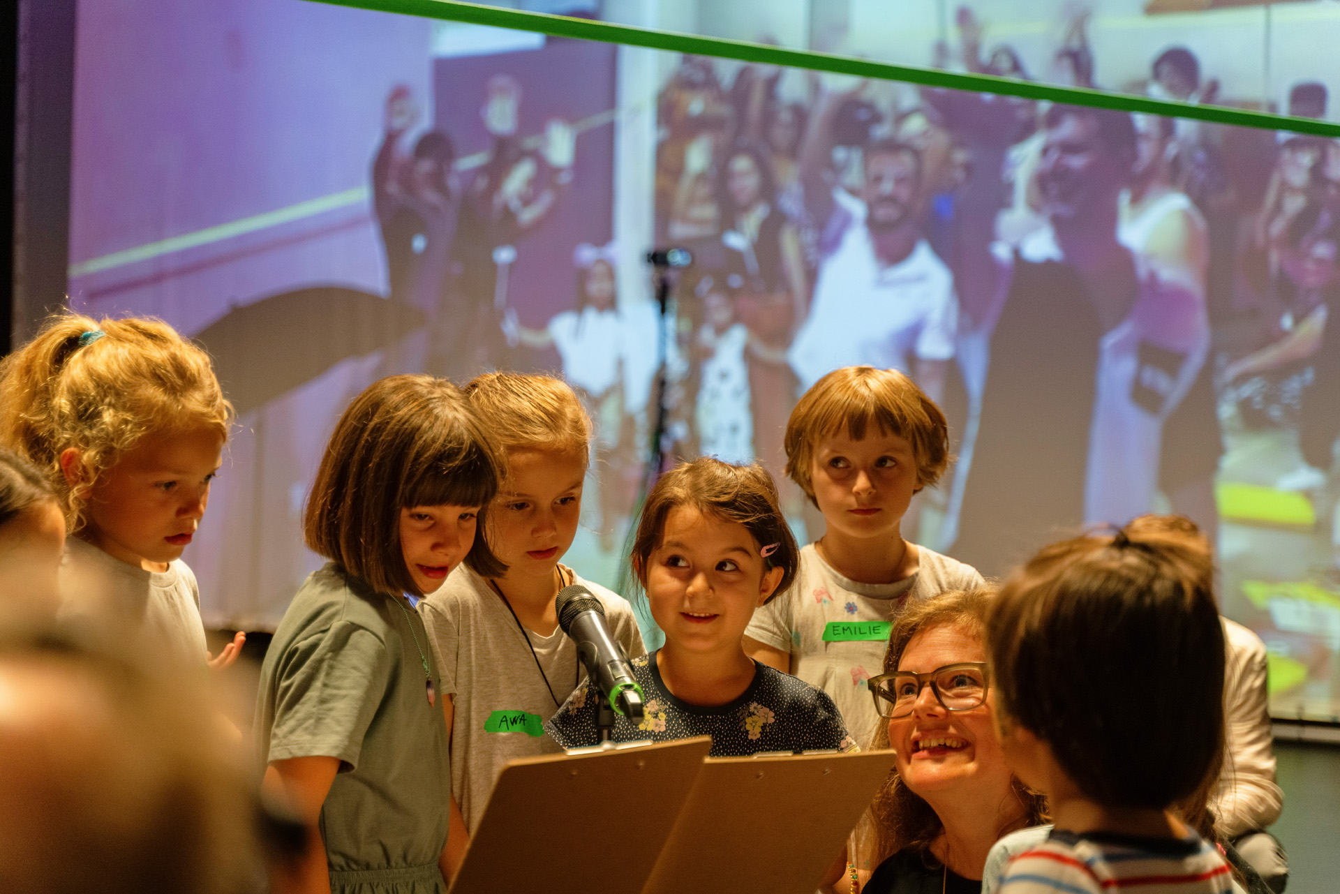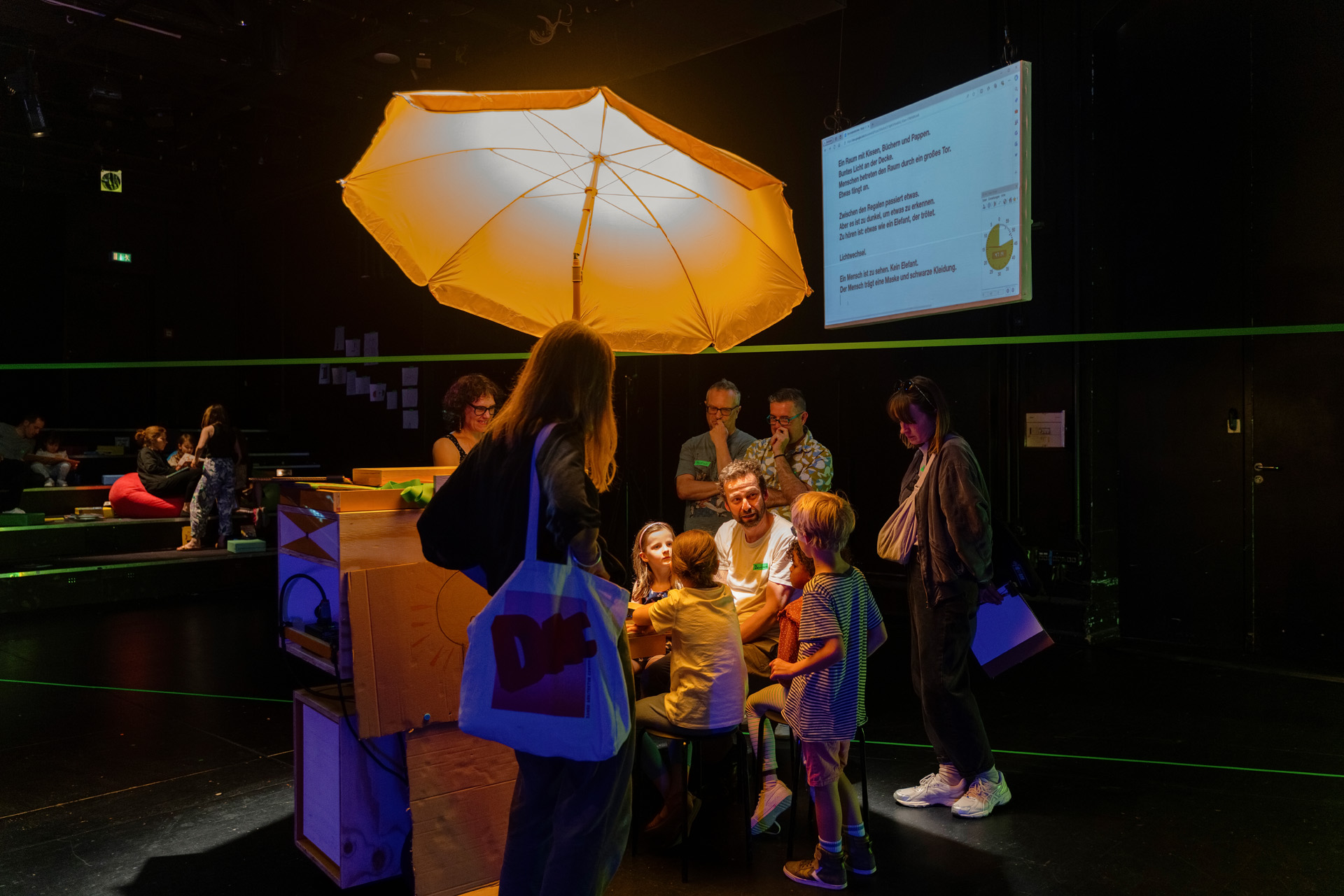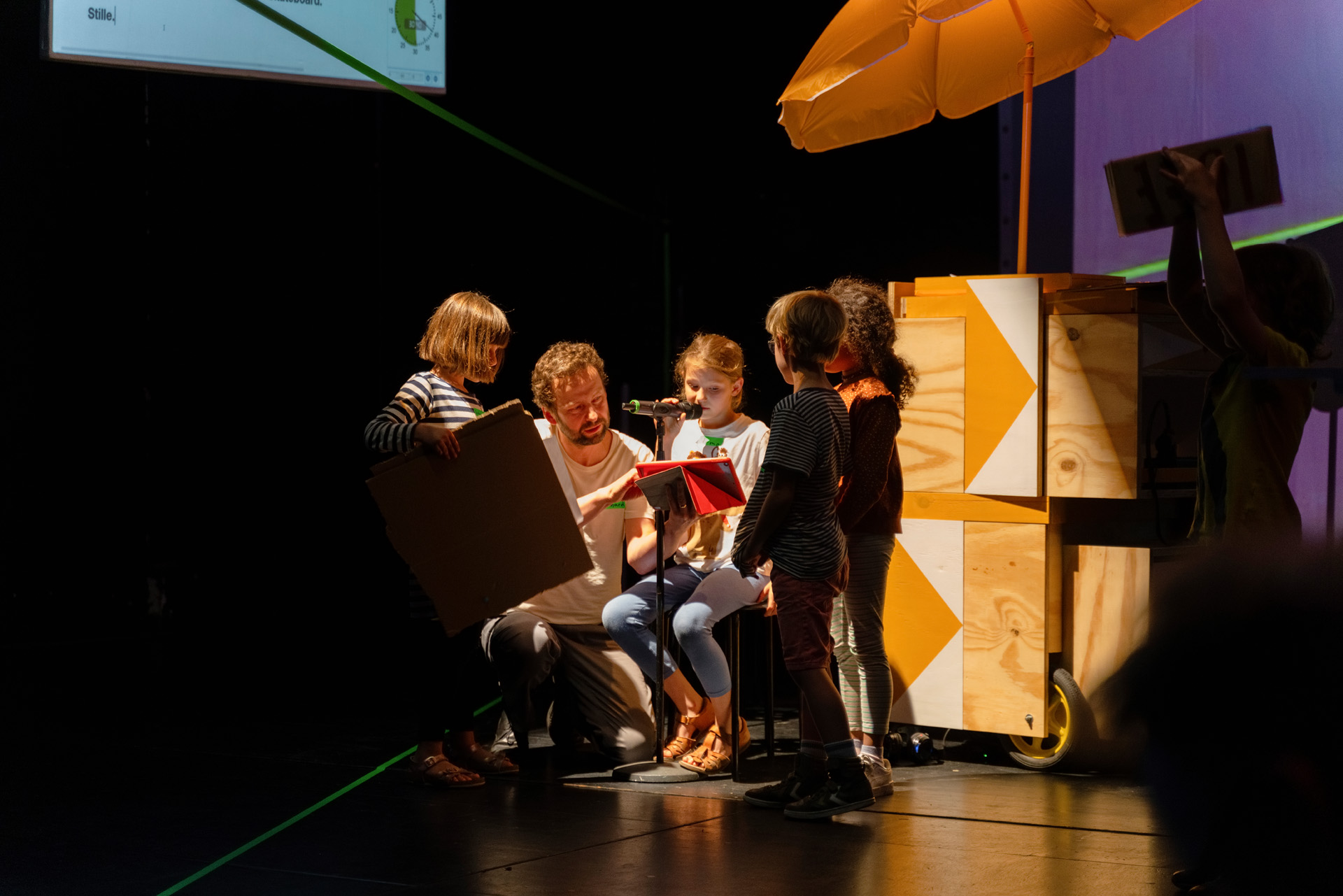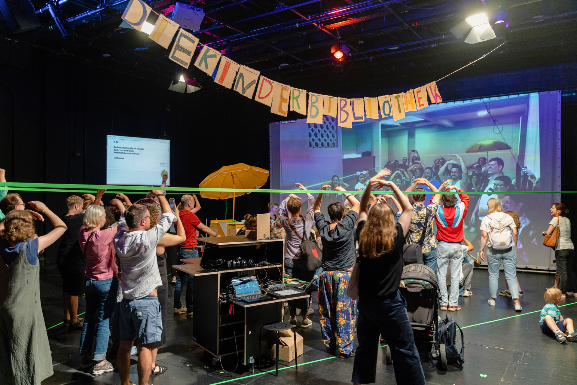 Beteiligte Kinder realisieren mit einer eigens für das Projekt erfundenen Technik kollaborativen Schreibens Skript, Bühne, Raum und Musik der Performance selbst. Live on stage, mit wechselnden Gäst:innen und dem Publikum.
